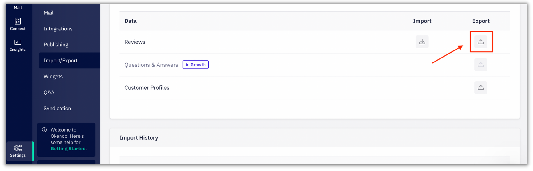 - In Okendo’s dashboard, go to Settings → Import/Export.