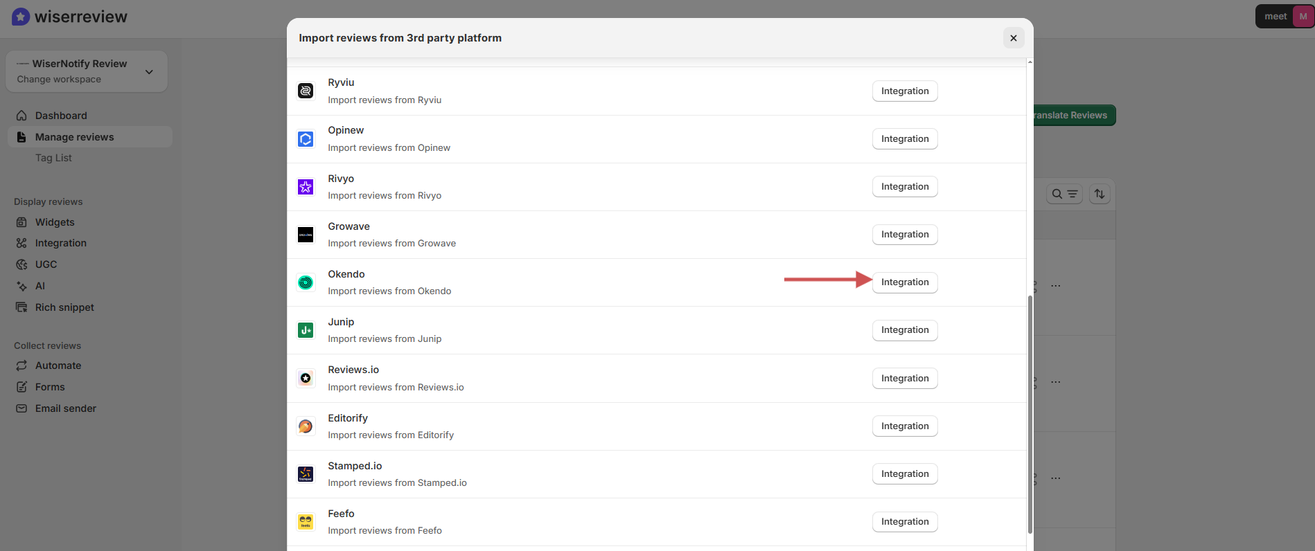 Step 2: Click on the “Integration” button with Okendo