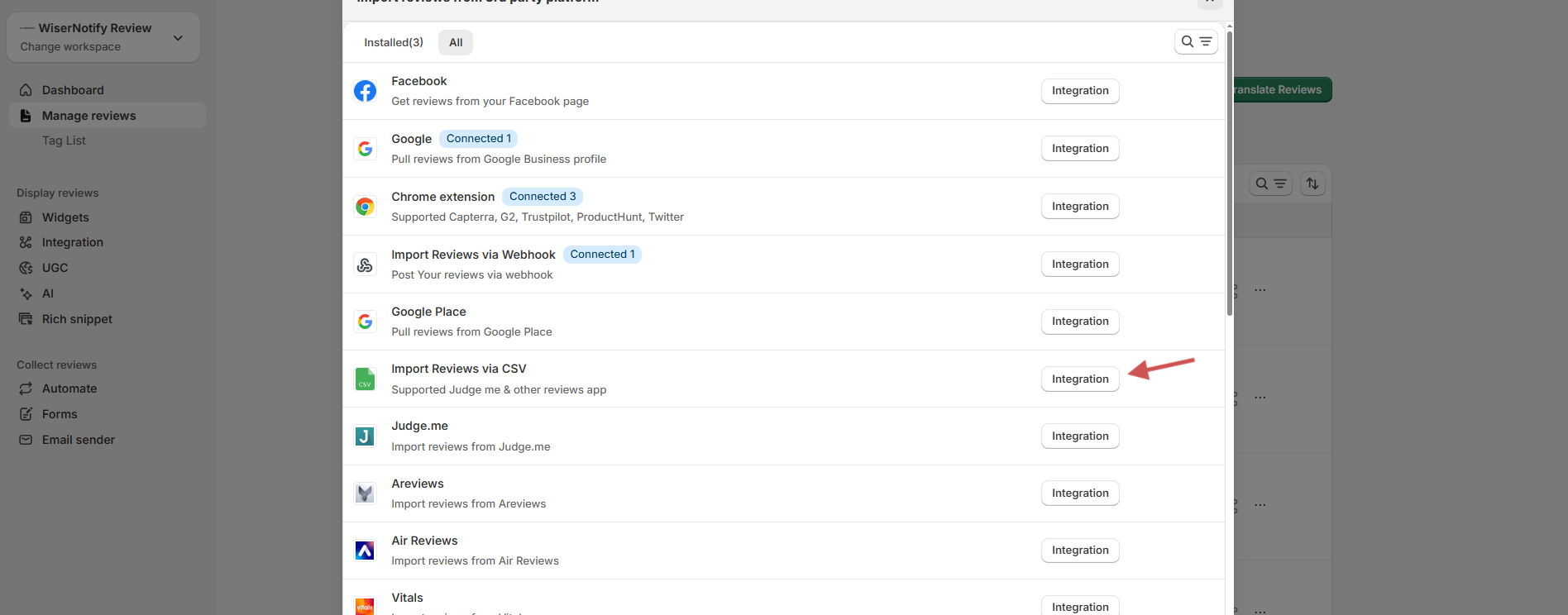 - Choose “Import reviews via CSV” from the available integration options.