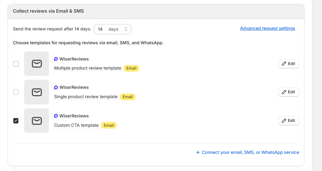 Connect your WhatsApp & SMS channels or tools to send review requests, and add a message template for WhatsApp or SMS in your marketing channel.