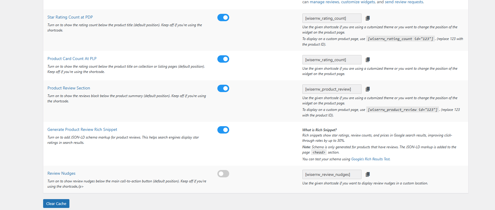 These settings control the star rating, review section, rich snippets, and more. You only need to turn them on once, and the plugin will handle the placement on your product pages.