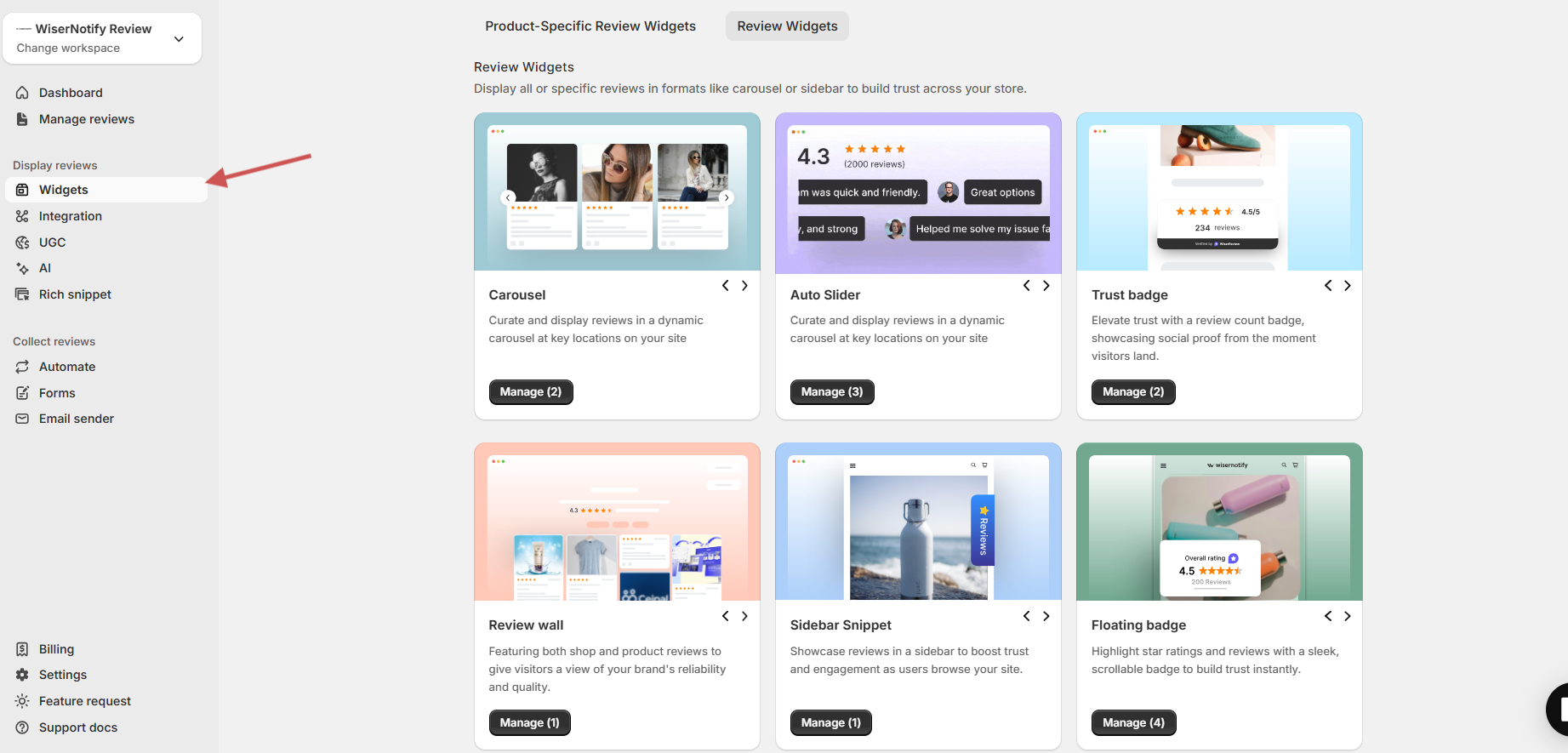If you do not want to place widgets manually, WiserReview can show your imported reviews automatically using its built-in options.