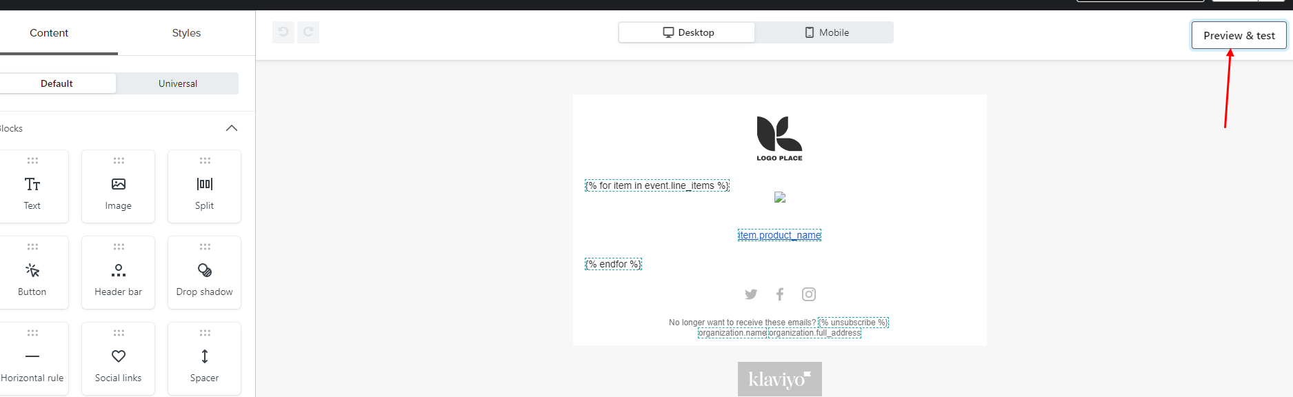 - Klaviyo will display test data associated with that event. Review this data to understand what information will be available for your emails.