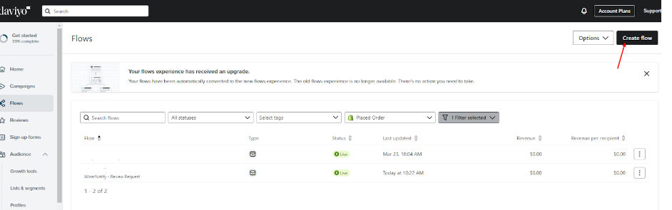 - Access Flows: Log into your Klaviyo account and navigate to the ‘Flows’ section from the dashboard.