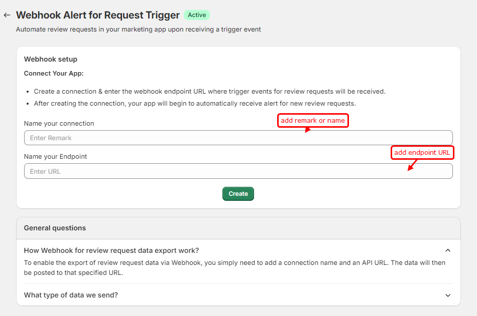 Add remark and provide an endpoint URL for receiving data from WiserReview and click on create button.