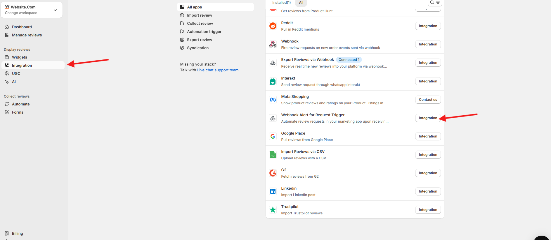 - Click on integration tab located left side menu.