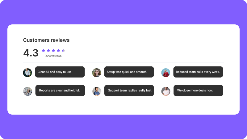 Embed reviews in landing pages, onboarding flows, or pricing modals by persona, use case, or plan.
