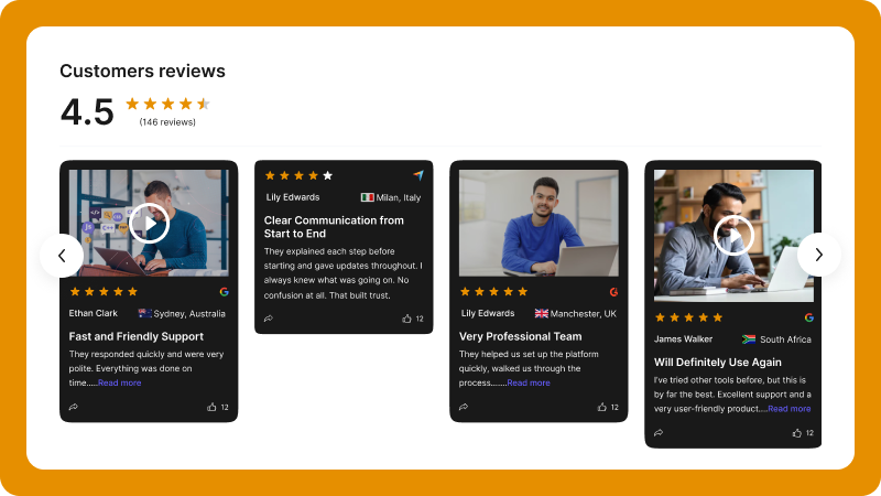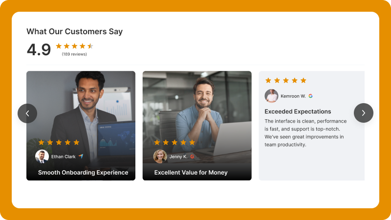 Highlight star ratings and reviews with a sleek, scrollable badge to build trust instantly.
