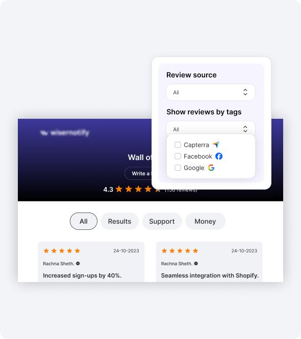 WiserReview gives SaaS teams complete control over how reviews are collected, organized, and published.