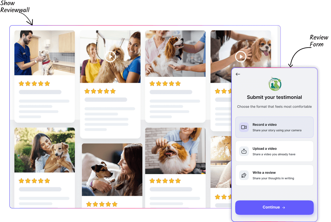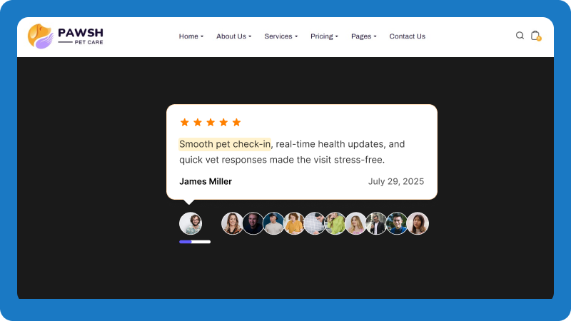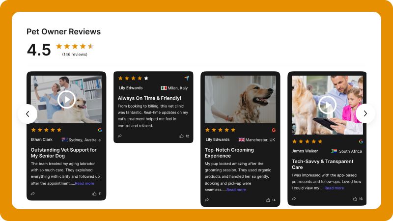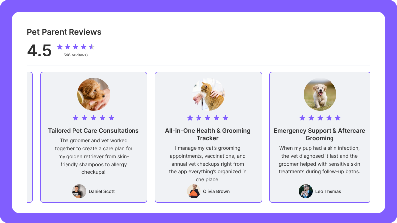 Showcase service reviews to highlight quality and build trust for both grooming and veterinary care.